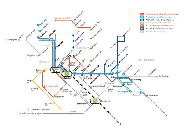bestehenden Regional- und Lokalbuslinien sowie als Zubringer zur S-Bahn. Bahnhof, Altkönigschule, Schwimmbad und Sportplatz liegen